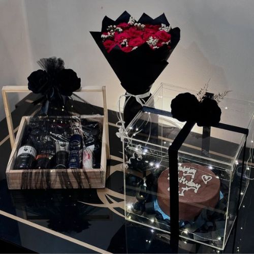This luxurious set features a delicious personalized cake in a light-up box, paired with an elegant wooden hamper filled with premium grooming essentials (like cologne or body care). A chic bouquet of deep red roses completes this perfect package for him.