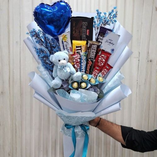 Blue Chocolate Bouquet with Teddy & Balloons