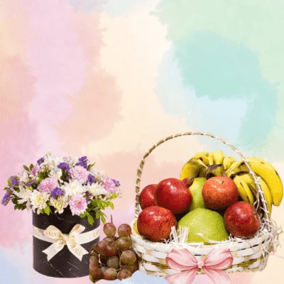 A thoughtful gift set featuring a basket of fresh seasonal fruits paired with a charming flower box, bringing health, beauty, and joy together in one perfect surprise.