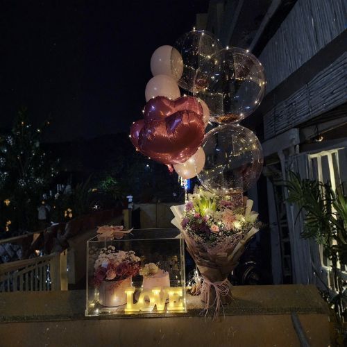 This dream set features a clear box with a cake, flowers, and a glowing ‘LOVE’ sign, all illuminated by twinkling fairy lights. Paired with a stunning bouquet and floating light-up balloons, it’s the ultimate romantic spectacle.